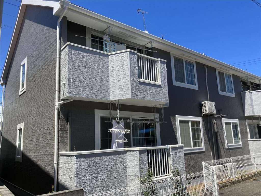静岡県榛原郡吉田町アパート塗装 2025年10月7日 最終更新日時 : 2025年10月7日 岸萬塗装株式会社 静岡県榛原郡吉田町のアパートを塗装させていただきました。外壁塗装、屋根塗装のご依頼をいただきました。
